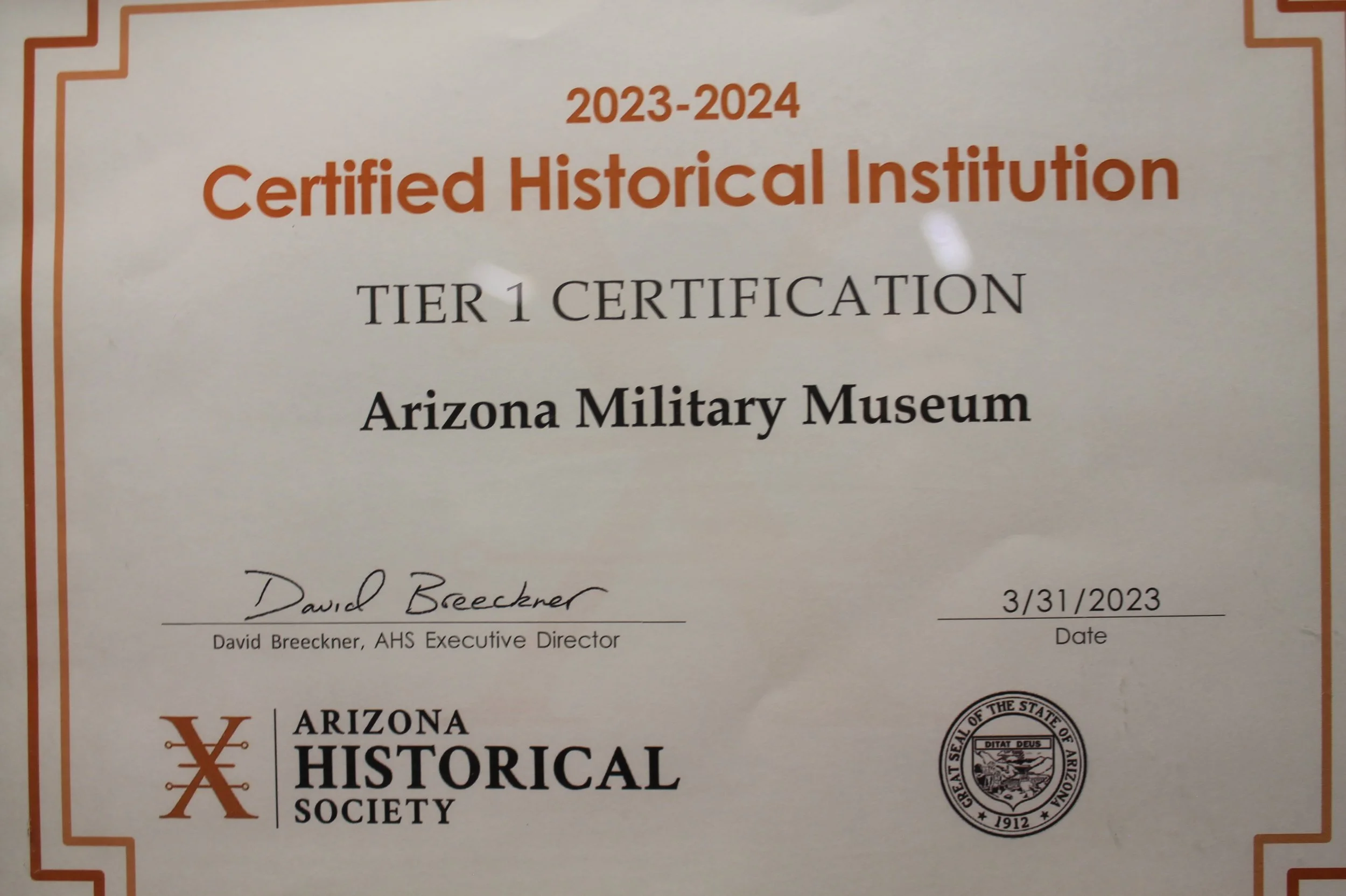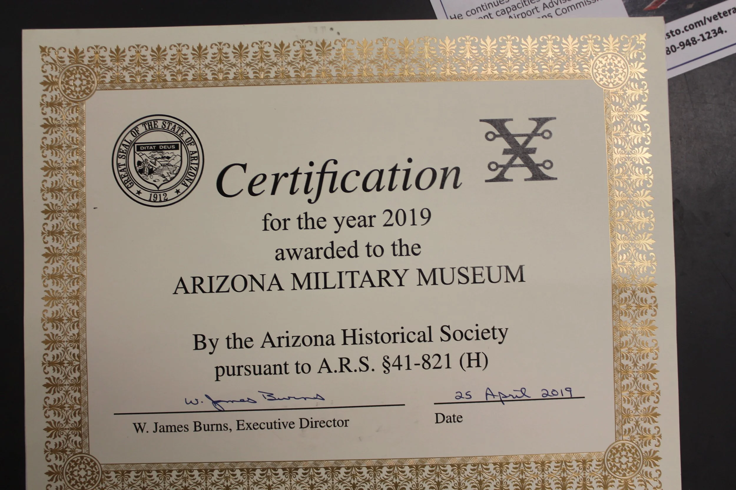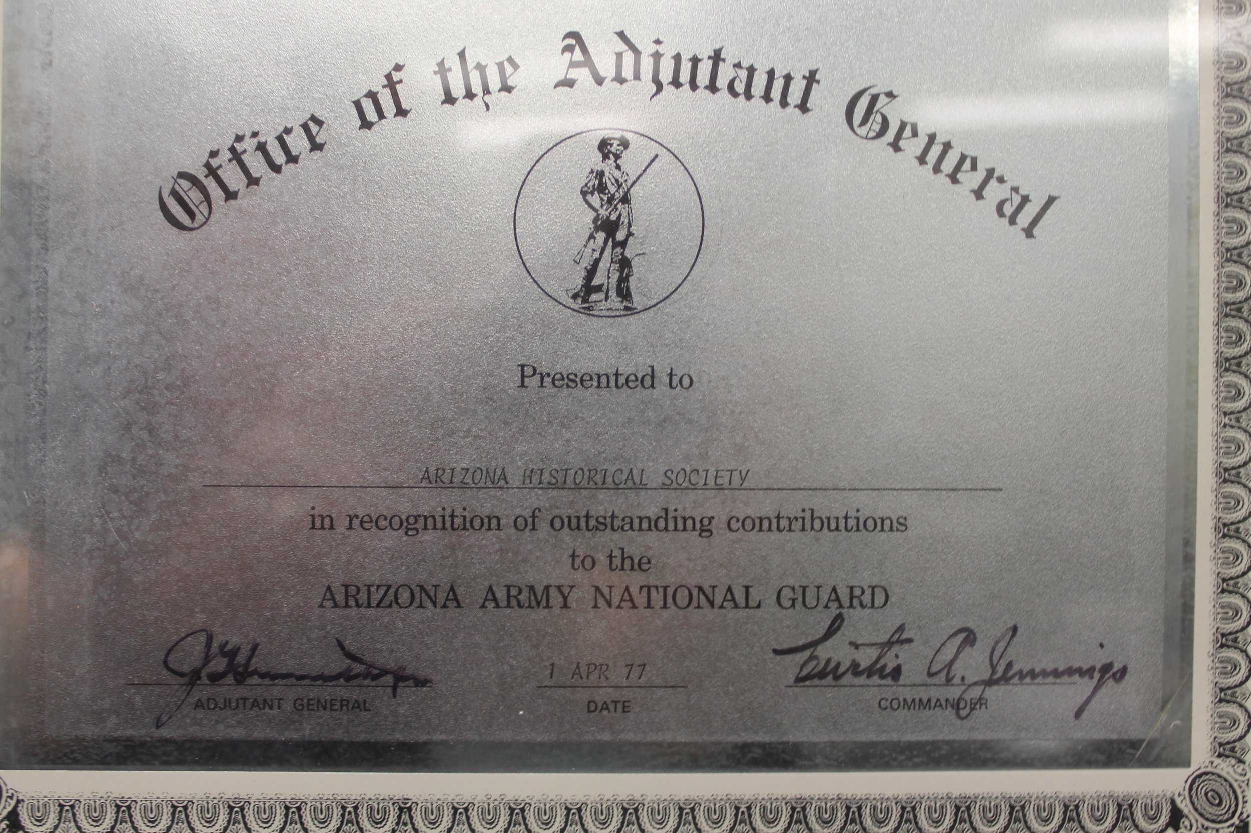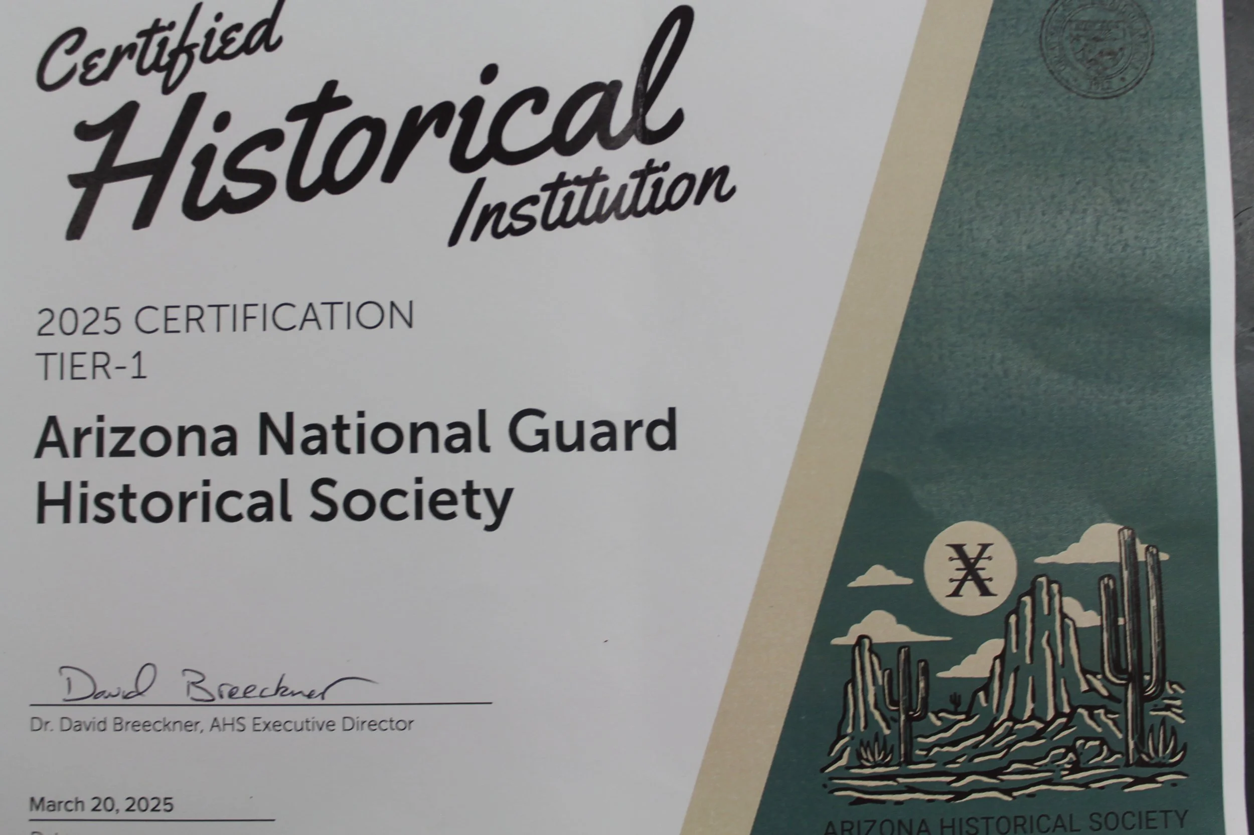 This page showcases some of the awards the Arizona National Guard Historical Society, dba Arizona Military Museum, has received. Use arrows under the images to scroll through all the awards.