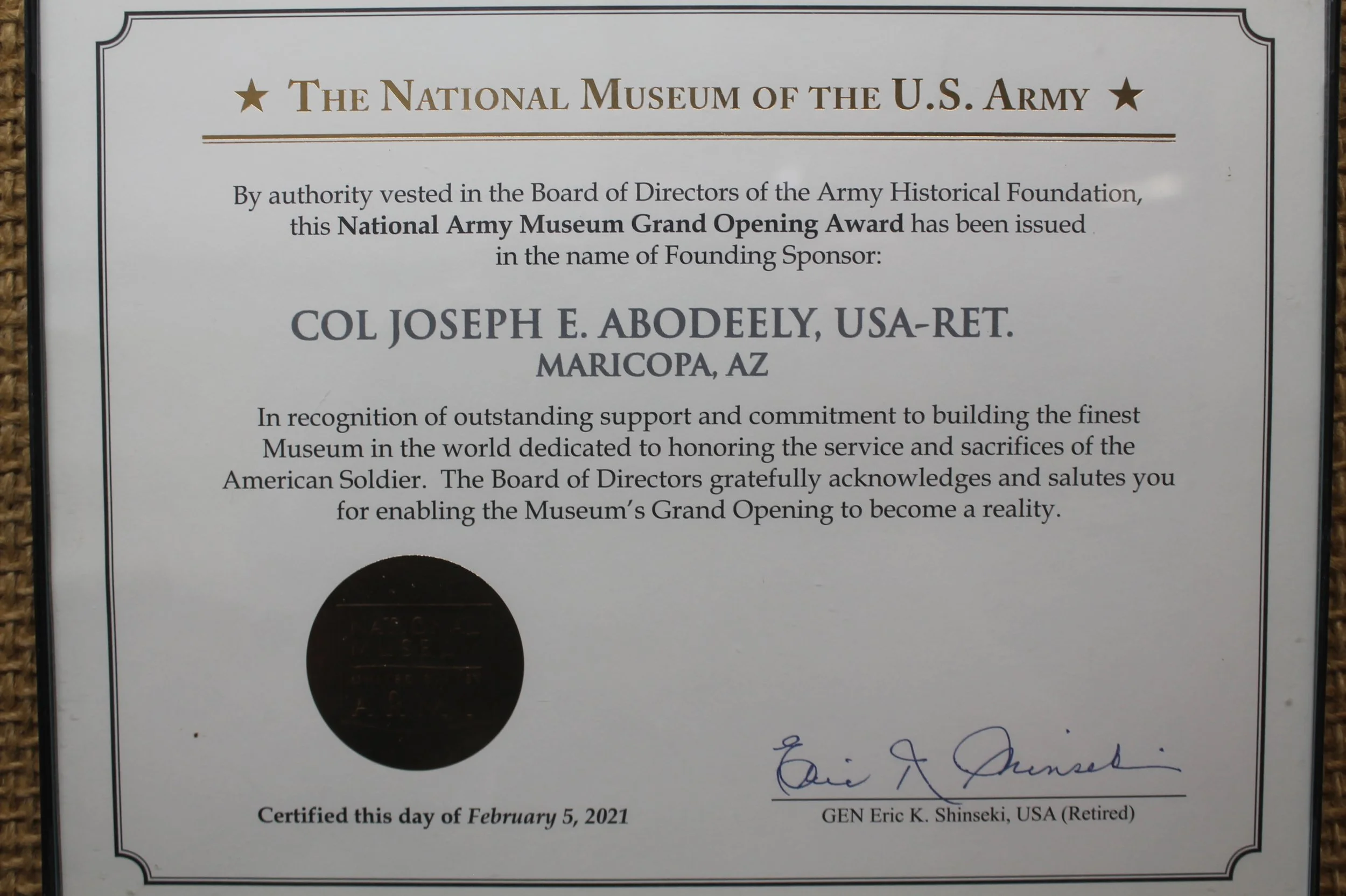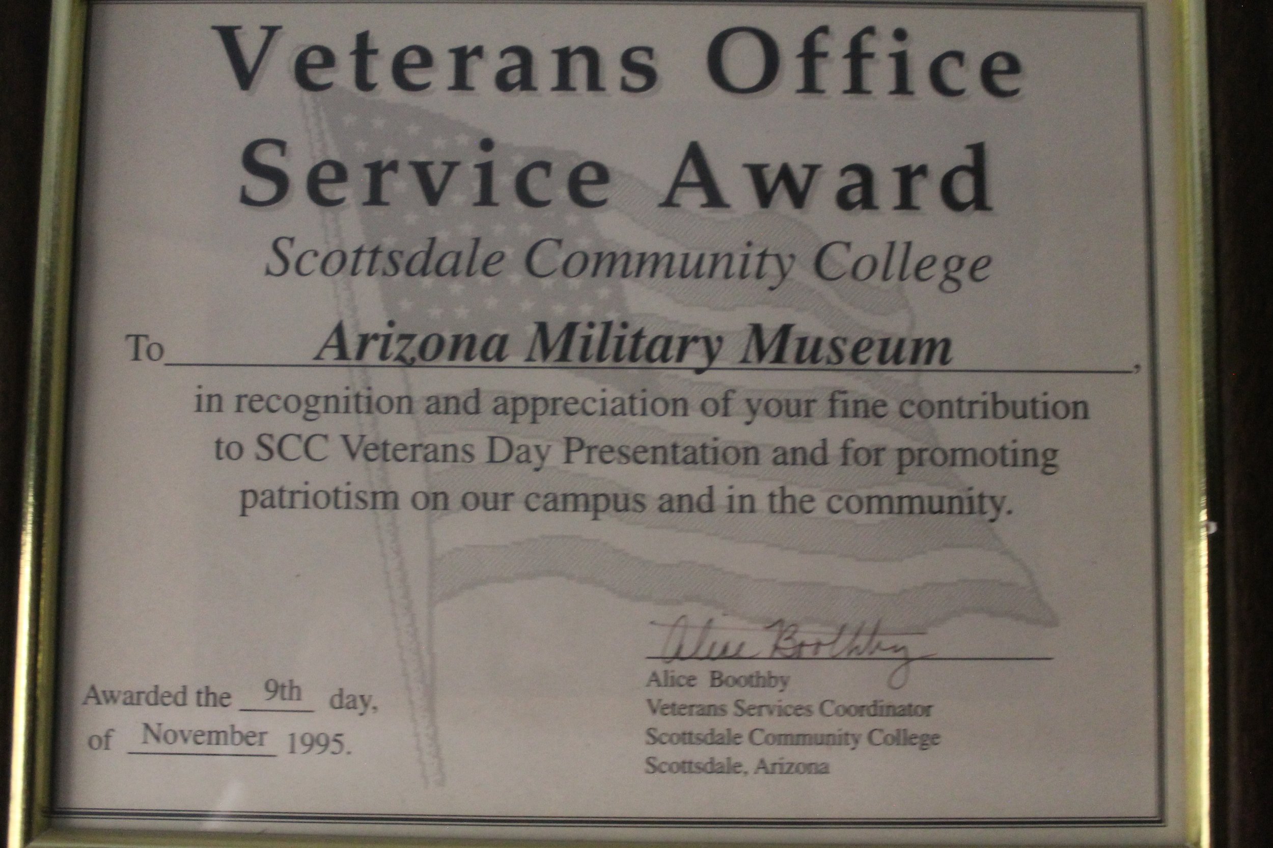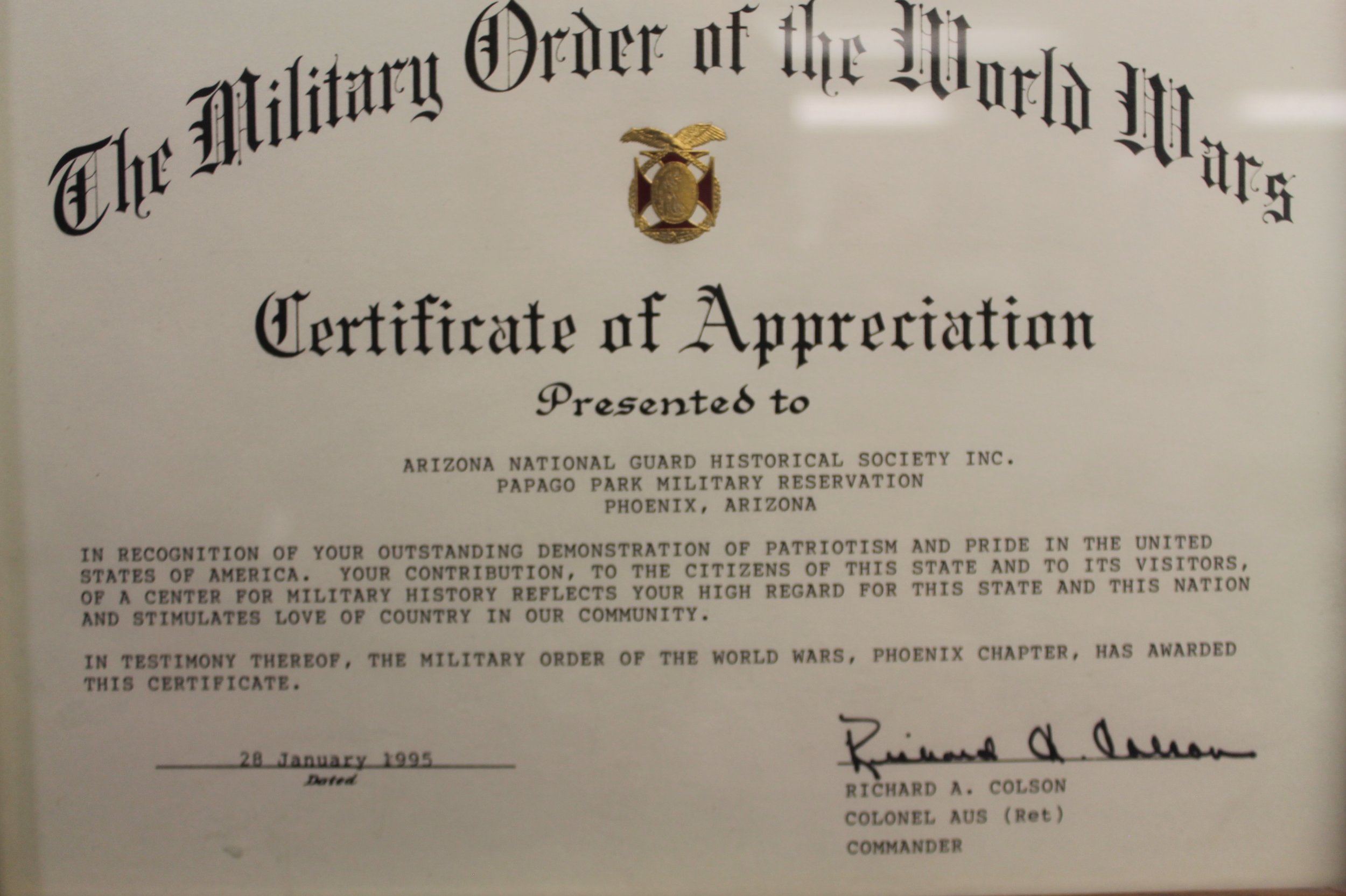 Some of these awards may show the name of Joseph Abodeely. Joe was the past president of the Board of Directors for the Arizona National Guard Historical Society, dba Arizona Military Museum, and a founding member of the Arizona Military Museum.