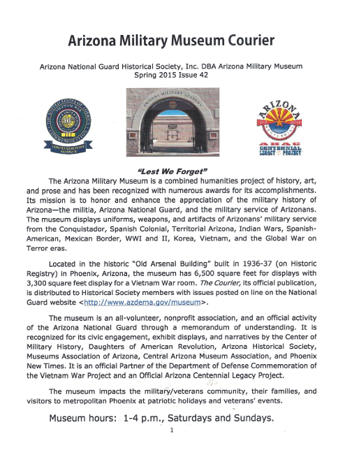 The Courier is the official publication of the Arizona National Guard Historical Society. Explore past issues of our Courier newsletter and discover updates, stories, and insights about Arizona’s rich military and personal histories. Our Courier shares updates on museum events, new exhibits, volunteer opportunities, and the incredible contributions of Arizona’s veterans.